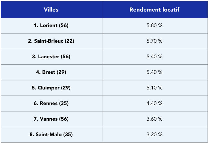 Selon le classement des villes françaises avec le meilleur rendement locatif en 2023 du magazine Le Revenu (Numéro spécial de mai 2023), vous pouvez investir en Bretagne à : Rennes, Brest, Quimper, Lorient, Vannes, Lanester et Saint-Brieuc.